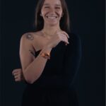 Mulher branca loira escura, vestindo camisa social preta com um colar prata fino