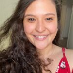 Mulher branca com piercing ferradura o septo, cabelos médios cacheados com as pontas rosas e pequenos brilhos colados pela pálpebra como maquiagem