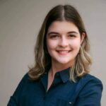 Uma mulher branca com cabelos médios castanhos, sorrindo com o dentes a mostra vestindo um cachecol roxo e um agasalho cinza claro com um parque arborizado ao fundo